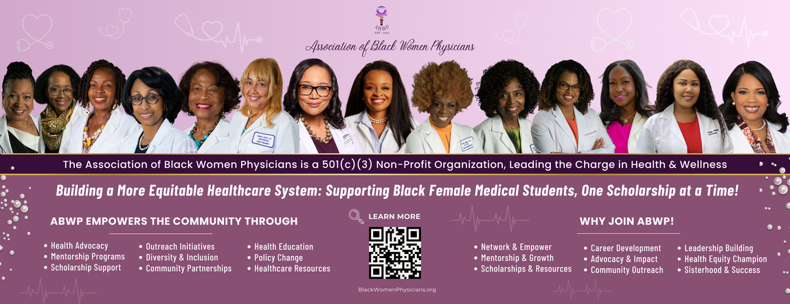 The Association of Black Women Physicians is a non-profit 501(c)(3) organization established in 1982 that is committed to community health literacy and public health advocacy. We provide an ongoing forum to support the success of African-American women in medicine, science, and public health. Because black women make up of only 2.8% of the physician workforce, ABWP creates critical opportunities for social networking and mentorship to students and trainees to increase diversity in the medical profession, specifically by supporting the pipeline of future Black women physicians. Annually, ABWP distributes scholarships to deserving medical students. Find out more about ABWP.